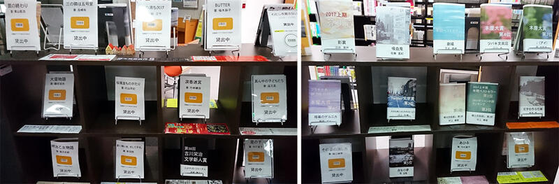 芥川賞や直木賞はもちろんのこと、 今年は技術書やレシピ本を対象とした賞の展示もしていますので、