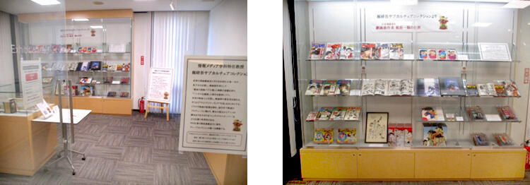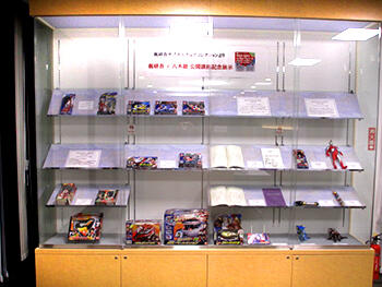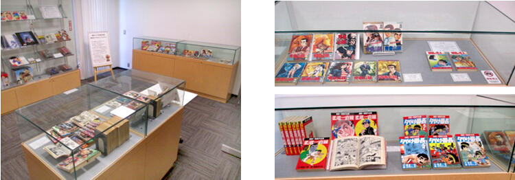 情報メディア学科特任教授の梶研吾先生から寄贈されたコレクションの中から、劇画原作者のパイオニア梶原一騎氏の作品や関連フィギュアなどを展示しています。