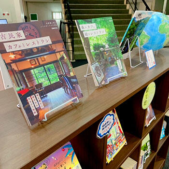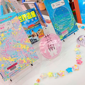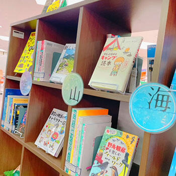 図書館では、「おうちで過ごす夏」と「外に飛び出す夏」をテーマに展示をしています。