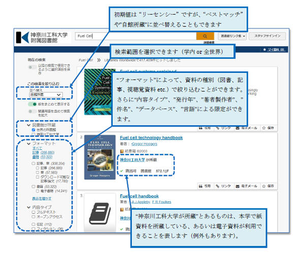 - 神奈川工科大学で所蔵しているもの・契約している電子情報が優先的に表示されます