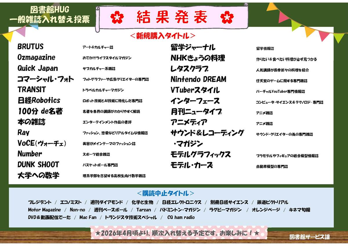 2025年9月~10月に行われた、図書館1階HUGの「一般雑誌入れ替え投票」の結果を発表いたします。
