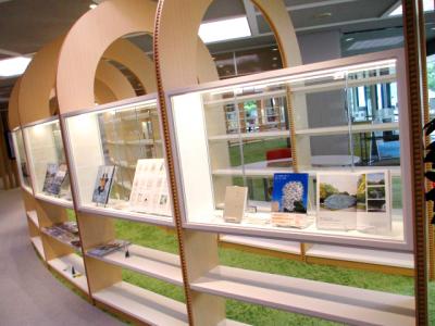 図書館1階にオープンしたくつろぎスペース「HUG」では特別コレクション展示を行っています。