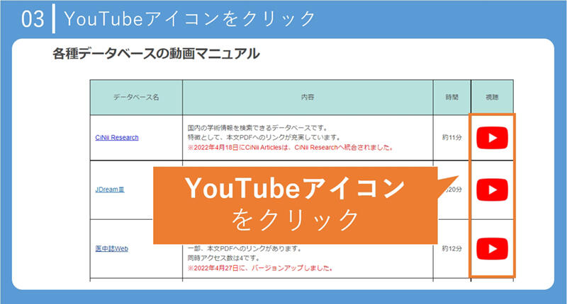 ページ一番下の「データベース動画マニュアル 視聴ページ」よりアクセスしてください。