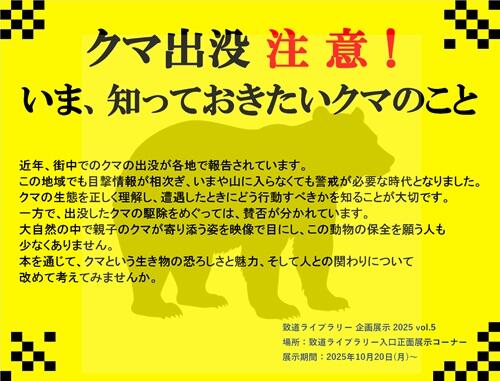致道ライブラリー入口正面展示コーナーにて『クマ出没注意!いま、知っておきたいクマのこと』展を開催しております。