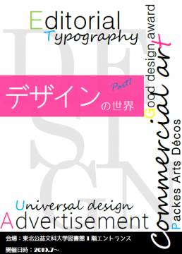 図書館では、数あるデザインの中から図書館になじみの深い印刷物周辺のデザイン-Editorial Design、Graphic Design-を中心に取り上げた【デザインの世界展 part1】を開催中です。