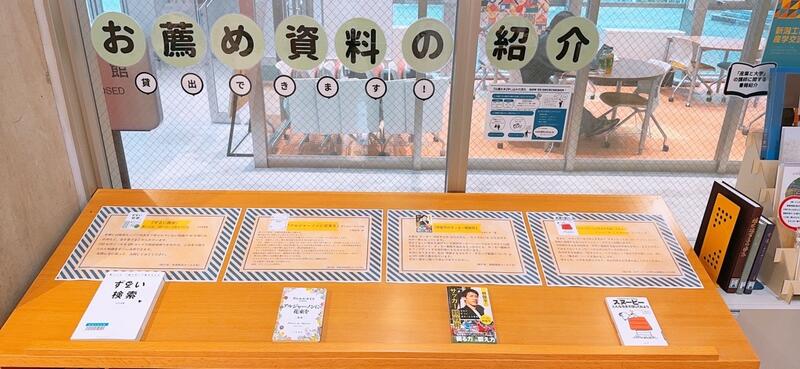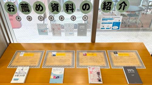 特集本、お薦め本、ともに図書館1F入口ゲート付近に展示してあります。