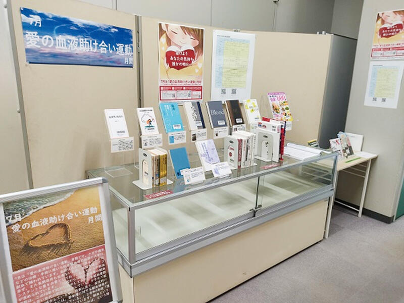 7 月は「愛の血液助け合い運動」月間です。ケガや病気 などの治療・手術に用いられる輸血用の血液の大半は、献 血で賄われています。血液は人工的に造ることが出来ず、 また長期保存も出来ないため、年間を通じてコンスタント な量を必要としており、私たちからの献血が求められてい ます。「10 代から30 代の若年層の献血者数は、この10 年 で約35%減少しており、全献血者数に占める若い世代の 割合は減少している。少子化で献血可能人口が減少してい る中、将来に亘り、安定的に血液を確保するためには、若 年層に対する献血推進がこれまで以上に重要になってい る。」と令和3 年版『厚生労働白書』に危機感が示されて います。献血というボランティアに関心を持っていただけ れば、という想いから今回の展示を企画しました。