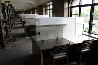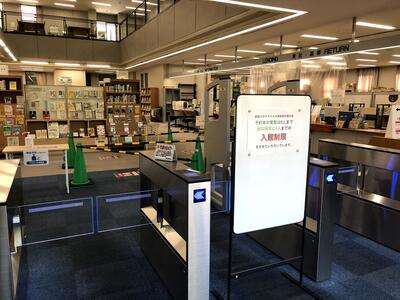 この時期の図書館は、新学期以降は閉館状態が続き、6月1日から滞在時間制限内での入館が再開されました。なお、コロナによる閉館により資料の返却が出来ず延滞が発生した場合には、罰則を免除する措置をとり、利用者の不利益にならないよう配慮しました。感染症対策として、返却された本は2日間返本台に留め置く処置を取り、カウンタ―には感染予防の透明ビニールシートが設けられました。COCOCHI(書籍消毒機)を設置し、目に見えない雑菌の除去、除菌、消毒に対応しました。また席数を制限した閲覧席には、図書館職員による手作りパーテーションが漸次設置されていきました。