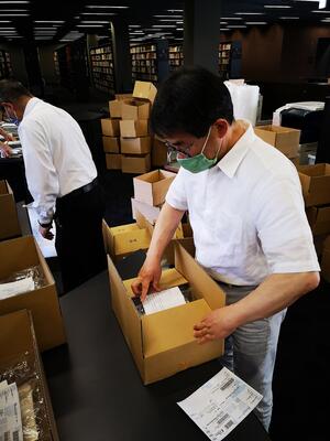 この時期の図書館は、新学期以降は閉館状態が続き、6月1日から滞在時間制限内での入館が再開されました。なお、コロナによる閉館により資料の返却が出来ず延滞が発生した場合には、罰則を免除する措置をとり、利用者の不利益にならないよう配慮しました。感染症対策として、返却された本は2日間返本台に留め置く処置を取り、カウンタ―には感染予防の透明ビニールシートが設けられました。COCOCHI(書籍消毒機)を設置し、目に見えない雑菌の除去、除菌、消毒に対応しました。また席数を制限した閲覧席には、図書館職員による手作りパーテーションが漸次設置されていきました。