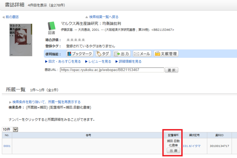 (配置場所が瀬田.館自動化書庫となっている資料です。)【R-WAVE検索結果画面】
