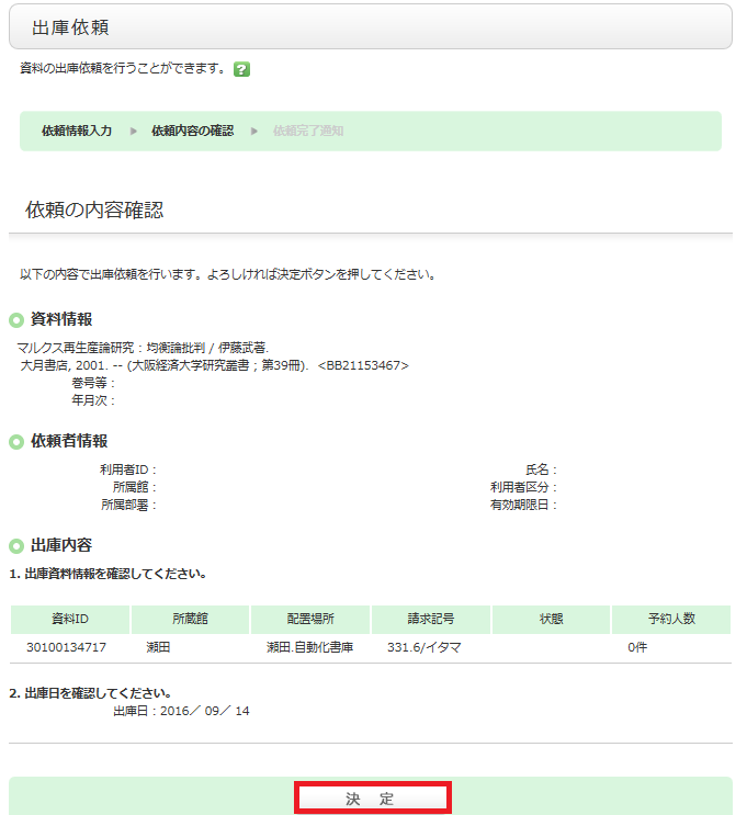 アイコンをクリックすると、出庫依頼画面になりますので、依頼内容を確認のうえ「決定」ボタンをクリックします。