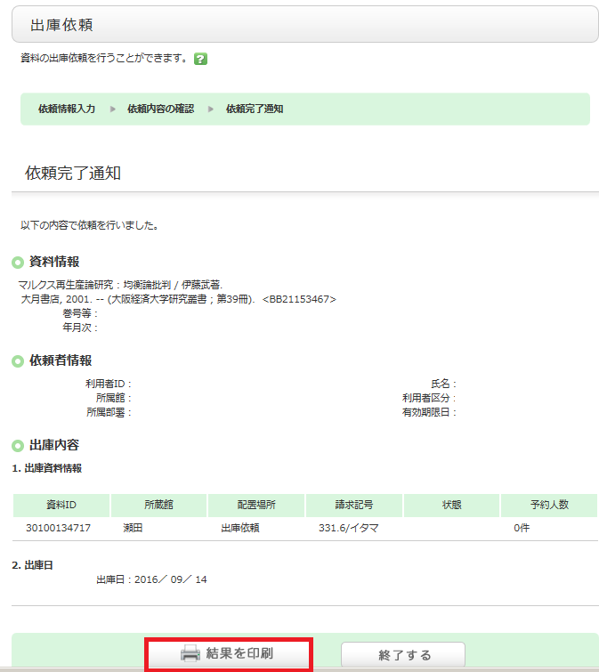 5.依頼完了通知の結果を印刷して、瀬田図書館本館1Fカウンターまで受け取りに来てください。