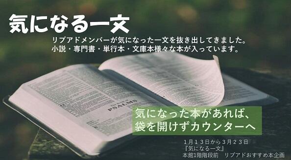 瀬田図書館本館一階にて「気になる一文」と題した展観を実施します。Libアドメンバーがそれぞれ選んだ本の中から本文中で印象に残った「一文」を抜き出しました。本は袋に入れてわからないようになっているので、「一文」だけで読みたい本を選んでみて下さい! 期間:2021年1月13日(水)~3月23日(火) 場所:瀬田図書館本館1階 ミニ展観コーナー(本館階段前) 主な展示資料: 内容は展示を見てのお楽しみです!