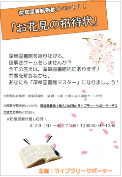 深草図書館では、新入生歓迎イベントとして、謎解きゲーム「お花見の招待状」を実施します。