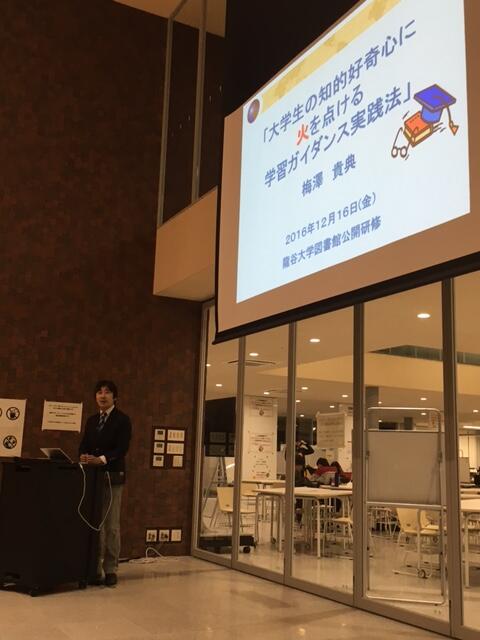 2016年12月16日(金)1時から、深草学舎アクティビティホールで2016年度図書館公開研修「大学生の知的好奇心にを点ける学習ガイダンス実践法」を開催しました。講師は、中央大学職員の梅澤貴典氏で、「裏付けのある情報を入手しよう」「検索結果はゴールでは無く入口である」といった観点に留意して、初めて研究レポートにチャレンジする大学1回生向けの模擬ガイダンスを行う形式での講演を行っていただきました。