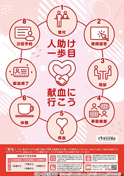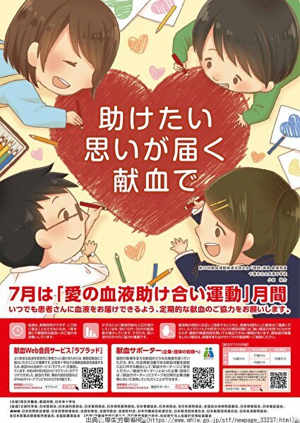 7月は「愛の血液助け合い運動」月間です。ケガや病気などの治療・手術に用いられる輸血用の血液の大半は、献血で賄われています。血液は人工的に造ることが出来ず、また長期保存も出来ないため、年間を通じてコンスタントな量を必要としており、健康な私たちからの献血が求められています。「10代から30代の若年層の献血者数は、この10年で約35%減少しており、全献血者数に占める若い世代の割合は減少している。少子化で献血可能人口が減少している中、将来に亘り、安定的に血液を確保するためには、若年層に対する献血推進がこれまで以上に重要になっている。」と令和3年版『厚生労働白書』に危機感が示されています。また毎年1~2月は「はたちの献血」キャンペーンも行われています。特定の月に献血の普及啓発活動が重点的に行われていますが、年間を通して献血は必要です。献血バスも本学近隣施設に定期的に巡回しています。献血というボランティアに是非ご参加をお願いします。