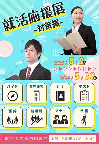 瀬田図書館では就職活動の採用選考が本格的に解禁される6月を前に、対策編と題して就活関連資料の展示を行います。ESをより良くするには?業界についてもっと深堀しておきたい!SPIや小論文対策がしたい!面接って何聞かれるの?戦略的に就活を進めるテクニックが知りたい!etc…。就活に悩めるあなたへお届けしたい資料を瀬田図書館中から集めました。不安を抱えている方にも、順調に進んでいる方にも、そして来年度以降に就活を控える3年生以下の皆さんにもおすすめです。龍大図書館は皆さんの就職活動を応援しています!