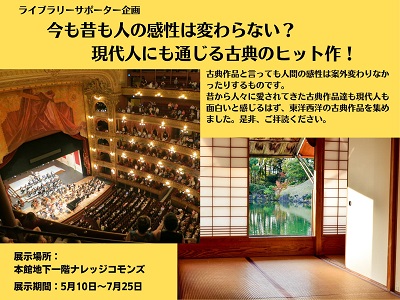 古典と聞くとどこかとっつきにくいと感じませんか?良くも悪くも人は人、いくら時代を経ていたとしても考えることは案外同じだったりします。古典の時代の人々も現代人も感性感覚の点において、そう変わりはしません。昔から人々に愛されてきた古典作品達も現代人も面白いと感じるはず、東洋西洋の古典作品を集めました。是非、ご拝読ください。(ライブラリーサポーター企画)