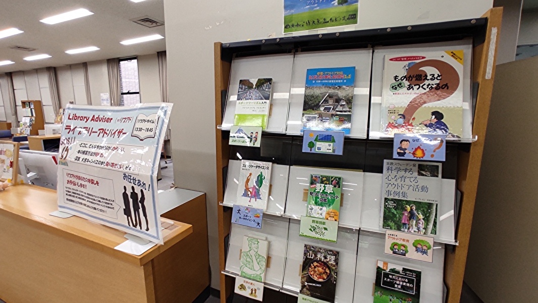 今月の月替わり!学部・DVD・新着本コーナーの展観は学部おすすめ本です!今回のテーマは、「アウトドア、スポーツ」です。夏も近くなり、外で活動する機会も増えていくのではないでしょうか?体を動かしたり外で活動する際に、役に立つ知恵や持っておきたい技術についての本を学部ごとに紹介します。