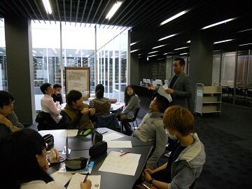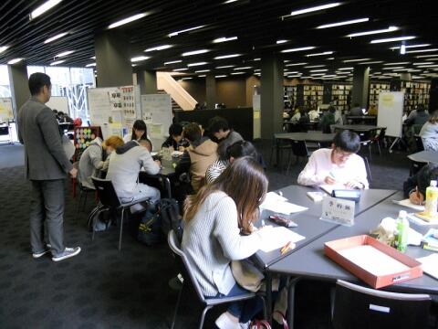 11月22日(水)13時15分から、深草図書館で文書力アップセミナーを開催しました。講師は、経済学部の木下謙朗先生で、「企業はどんな文章を必要としているか」「企業はどんなコミュニケーション能力を求めているか」といった観点に留意して、「思考マップ」に基づいたワークショップ形式でのセミナーを開催していただきました。