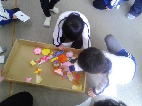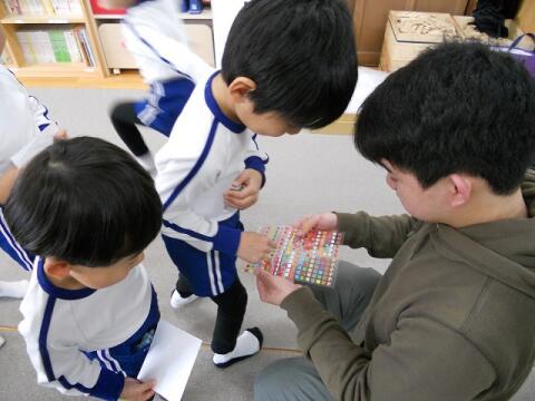 ライブラリーサポーターは幼児教育について専門には学んでいないため、紙芝居上演にあたっても、いろいろと試行錯誤がありました。紙芝居「親鸞さま」は、子ども向きの台本もありますが、その内容は幼稚園児には少し難しいところもあるように思われました。そのため、上演の合間に紙芝居の内容を問うクイズタイムを設け、園児の参加意識を高めることに努めました。この試みは大成功で、クイズタイムになると園児たちは、大変にはしゃいだ様子を見せていました。クイズに正答した園児には、設問毎に動物や果物のシールが配られ、園児たちも楽しそうにシールを集めていました。クイズは9問出され、最終的には、シールの数に応じて、ライブラリーサポーターが作成した紙のメダルや様々な折り紙がプレゼントされました。