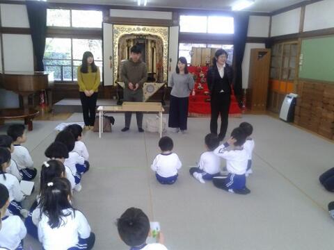 220日(火)、ライブラリーサポーターは「本願寺中央幼稚園」に出かけ、紙芝居「親鸞さま」を上演しました。当日は年中組(4歳児)の1クラス(約30名)が対象となりました。本願寺中央幼稚園は、大宮図書館に隣接しており、本学とも所縁の深い幼稚園です。