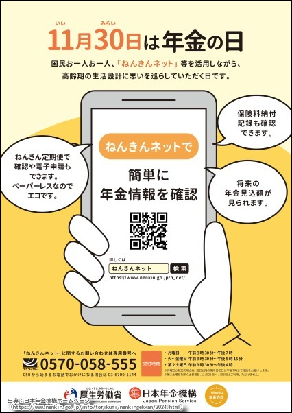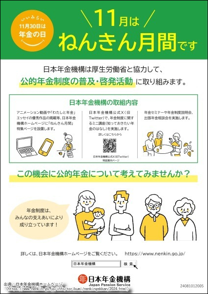 11月は、ねんきん月間です。「年金」が貰えるのは遠い将来のことで、今の自分には関係ない、と誤解している方おられませんか?老後の生活費用だけが「年金」ではありません。事故などで障害が残った時や一家の働き手が亡くなった時にも支給される「年金」、みんなで支え合う仕組みが「国民年金」といわれる公的年金制度です。20歳以上60歳未満のすべての方に加入義務があります。20歳になると日本年金機構から国民年金に加入したことのお知らせが届きます。保険料は16,980円/月(令和6年度)です。学生の皆さんにとっては結構高額ですよね。でも心配いりません。大学在学中で一定の所得以下の場合、「学生納付特例制度」を申請すれば保険料の納付が猶予されます。20歳になるまでに年金制度について勉強して、将来のリスクに備えましょう。