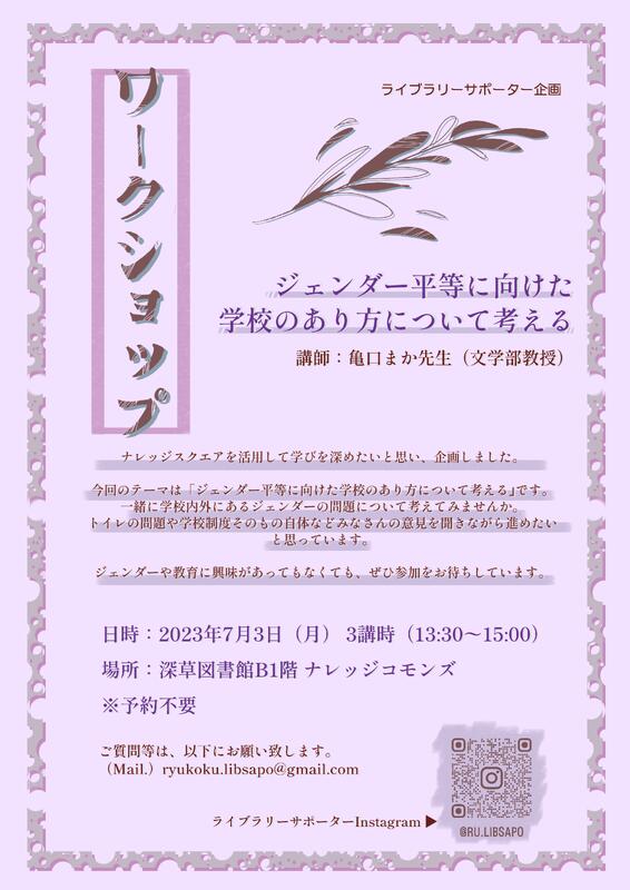【ライブラリーサポーター企画】 ワークショップ「ジェンダー平等に向けた学校のあり方について考える」の開催について