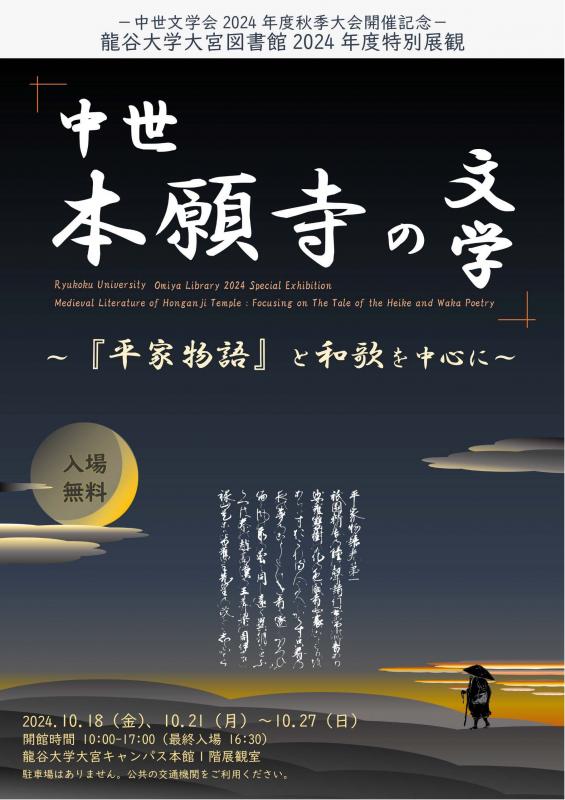 大宮図書館では、2024年度特別展観として「中世本願寺の文学~『平家物語』と和歌を中心に~」を10月18日(金)、21日(月)~27日(日)の期間、大宮キャンパス本館展観室に於いて開催します。今回の展観は、中世文学会が、10月26日(土)、27日(日)に大宮キャンパスで開催されることを記念して開催されます。