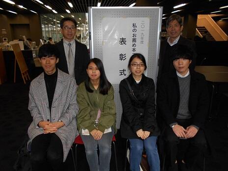 受賞者の皆さんと審査員(道元図書館長、三原文学部教授)
