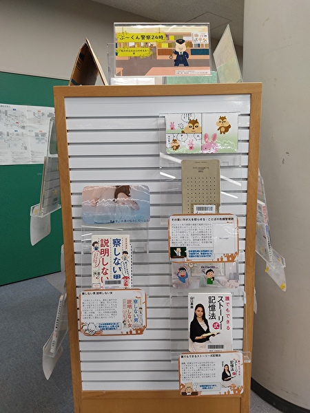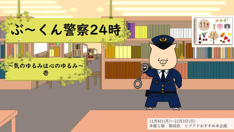 瀬田図書館本館1階展観コーナー、11月のテーマは「ぶーくん警察24時 ~気のゆるみは心のゆるみ~」です。