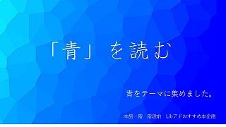 瀬田図書館本館一階にて「「青」を読む~青をテーマに集めました。~」と題した展観を実施します。Libアドメンバーそれぞれが考えた「青」にまつわる本を集めました。
