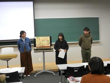 また今回は、1222日(金)に、ライブラリーサポーターがホームルームのクラスで紙芝居を上演しました。紙芝居の題材は『親鸞さま』です。この紙芝居は飛び出す絵本の仕掛けで立体になっており、留学生にも絵を通した理解も可能であると思われ交流の素材としました。当日は、サポーター3名が、ナレーションや紙芝居のめくり役を手分けして実施しました。また、紙芝居の合間には、ストーリーの展開をより理解してもらうために「小話」の時間が設けられ、「阿弥陀籤」や「山伏」についての紹介がなされました。上演後も、留学生からは、紙芝居のストーリーなどについて質問がなされ、サポーターたちも懸命に応答していました。JEPクラスは、アジアや欧米など様々な国からの留学生が在籍しており、ライブラリーサポーターが紹介する日本の本や文化、習慣などについて、それぞれの留学生も大きな興味・関心を寄せていたようです。