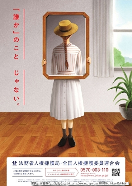 日本においては1947年5月3日に日本国憲法が施行され、その第11条等に基本的人権の尊重が謳われています。1948年、第3回国連総会においても「世界人権宣言」が採択され、人権の国際的基準が示されました。その採択日である12月10日は「人権デー」と定められ、日本では「人権デー」を最終日とする1週間(12月4日~12月10日)を「人権週間」と定め、広く人権の啓発を行っています。私たちのまわりで人権は尊重されているでしょうか。差別やいじめ、ハラスメント等々が当たり前のように存在し、社会問題となっています。被害者が泣き寝入りしているケースも多いでしょう。見て見ぬふりをしている人もいるかもしれません。他人事ではなく、自分がその当事者だったらどうするのか、思いを巡らせてみましょう。