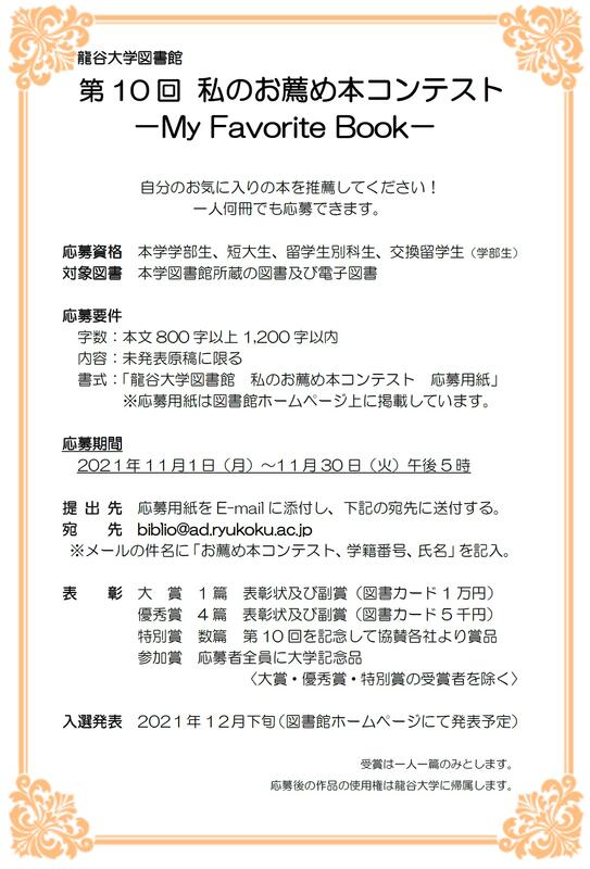 龍谷大学図書館では、学部生、短大生、留学生別科生、交換留学生(学部生)の皆さんを対象とした「私のお薦め本コンテスト-My Favorite Book-」を実施します。