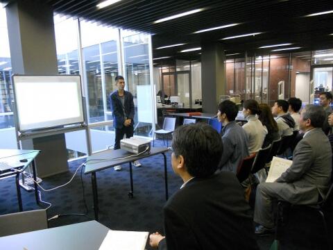 今回のプレゼンテーション企画は、その文章をパワーポイントに再構成したもので、まさに「安藤図書館長への提案」が実現することとなりました。その場は安藤館長以外にも、お薦め本コンテスト審査委員の三原先生、杉村図書館事務部長、さらに木下先生も同席されました。またお薦め本コンテスト受賞者の学生も一緒に、佐藤さんの提案を聞き、プレゼンテーション後は、「龍大生と読書」を巡って相互に意見交換がなされました。
