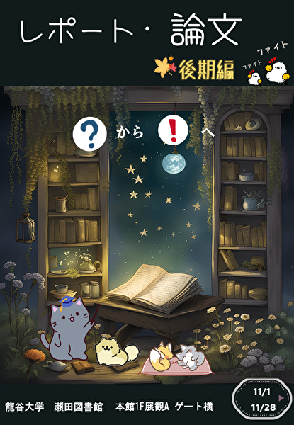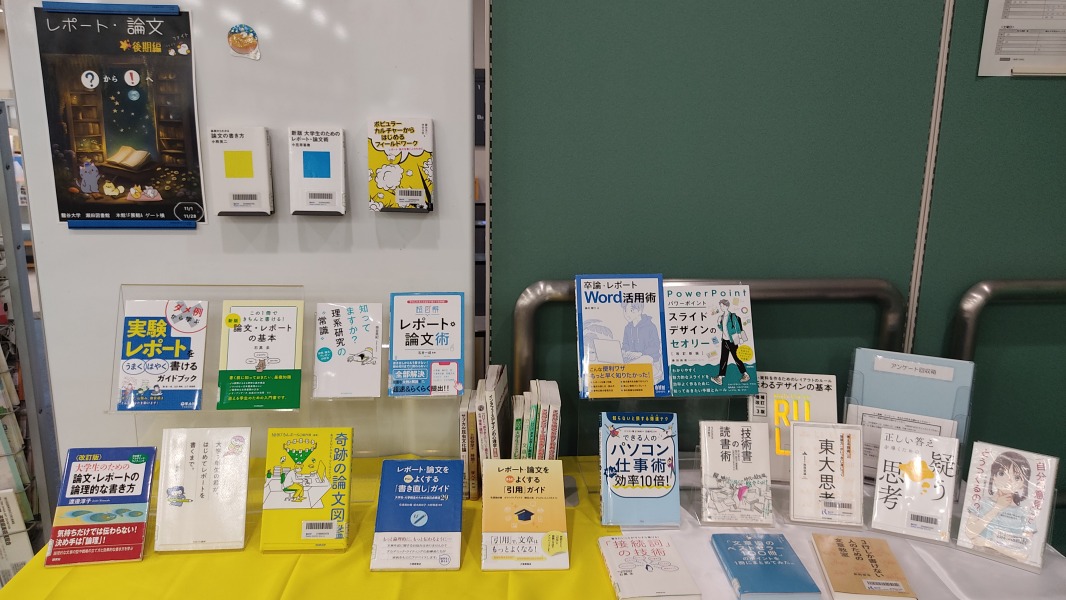 学期末が近くなり、日々、レポートの作成に追われる方や、卒業論文作成に頭を悩まされている方が沢山いらっしゃるかと思います。そんなお悩みを少しでも解決出来るお役立ちになればと思い、瀬田図書館では後期も「レポート・論文」展を開催いたします。テーマ探し、情報の入手の仕方、手に入れた情報のまとめ方に関する図書などを展示しています。あなたの「?」が少しでも「!」に変わる事が出来ますように応援しています。資料はすべて貸出可能です。この機会にぜひご利用ください。