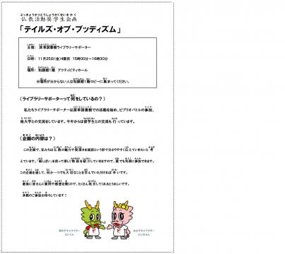 既報のとおりライブラリーサポーターが、2016年度仏教活動奨学生に採用されました。この活動として、今回「ティルズ・オブ・ブッディズム」(仏教説話の読み聞かせ)を実施することとなりました。