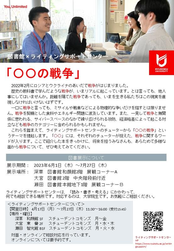 ライティングサポートセンターのチューター(本学大学院生)が「〇〇の戦争」というテーマで選書した本を、図書館にて展示します。