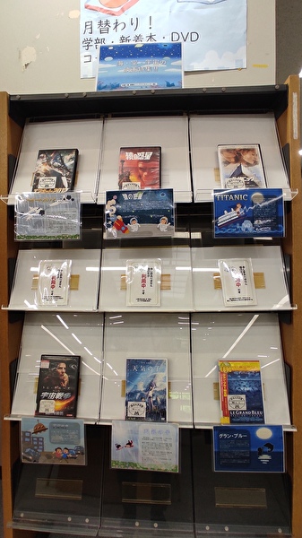 今月の「月替わり学部・文庫・DVDコーナー」では「DVD」を展観します。タイトルは、『海・空・宇宙の映画特集‼』です。海・空・宇宙が舞台の映画を、それぞれ二本ずつ集めました。現実とはかけ離れた広い世界で繰り広げられれる、ラブストーリーやサスペンス、アクション映画をお楽しみください!それぞれの海・空・宇宙の風景にも注目です!