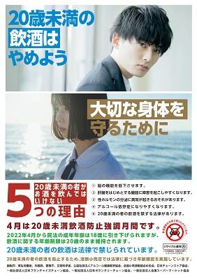 4月は20歳未満飲酒防止強調月間です。2022年4月から民法の成年年齢は18歳に引き下げられますが、飲酒に関する年齢制限は20歳のまま維持されます。20歳未満の者の飲酒は法律で禁じられています。当然20歳未満の者に飲酒を勧めてもいけません。20歳以上の方も他人への無理強いや一気飲みは厳禁です。死の危険のある急性アルコール中毒に直結します。自分も他人も大切にしましょう。