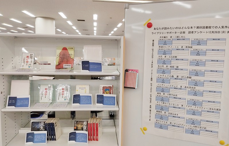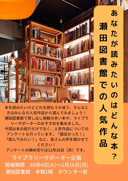 本を読みたいけどどれを読もうか迷う、そんなときはみんなの人気作品から選んでみましょう!瀬田図書館で貸し出し冊数の多い本や、ライブラリーサポーターのおすすめを集めました。今回は本の紹介だけでなく、人気作品についてのアンケートも行っています。「面白かった!」「読んでみたい!」など、皆さんの声を聞かせてください!アンケートの締め切りは12月26日(月)です。(ライブラリーサポーター企画)