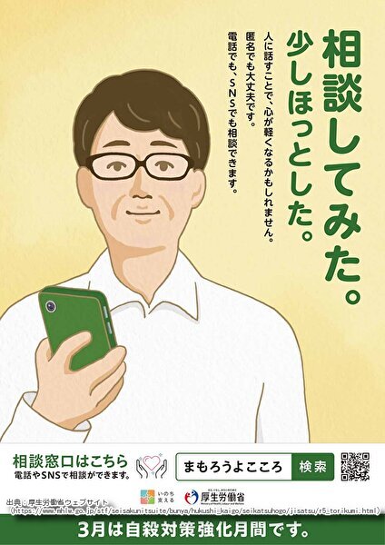 3月は自殺対策強化月間です。警察庁の資料によると令和4年の自殺者数は21,881名(男性14,746名、女性7,135名)にのぼります。10年ほど前と比べて減少したとはいえ、年間2万人以上の方が自ら命を絶っている現状は依然として深刻と言えるでしょう。これは交通事故の死者数の約8倍に相当します。政府や自治体も対策を講じていますが、私たち個人で出来ることもあります。なにも難しいことをする訳ではありません。先ず悩みを抱えている友人、家族や知り合いに気付いて、声をかけ、気持ちを聞いてあげましょう。それだけでも不安な気持ちを和らげる効果があります。そして自治体等が行っている相談窓口を紹介してあげましょう。後は寄り添って見守ってください。このような役割を「ゲートキーパー」と言います。悩みを抱えている方には大きな心の支えになることでしょう。
