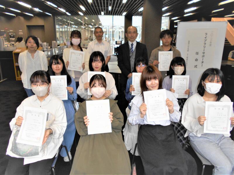5月29日(月)に深草図書館で、ライブラリーサポーターの任命式を行い、新サポーターの紹介、図書館長の挨拶、記念撮影などが実施されました。