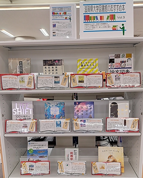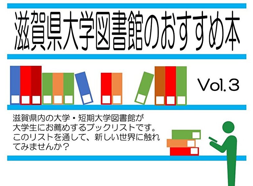 滋賀県内にある13の大学・短期大学が加盟する滋賀県大学図書館連絡会において、図書館の利用促進の一環として「おすすめ本」を各館1冊を選定しブックリストを発行しています。今回が3回目の発行となり、各大学図書館一押しのおすすめ本を展示します。様々なジャンルから選ばれたバラエティーに富んだラインナップになっています。是非ご一読ください。