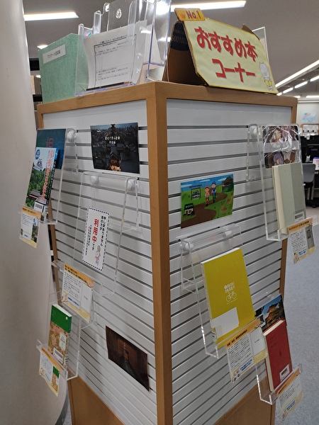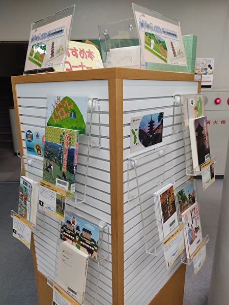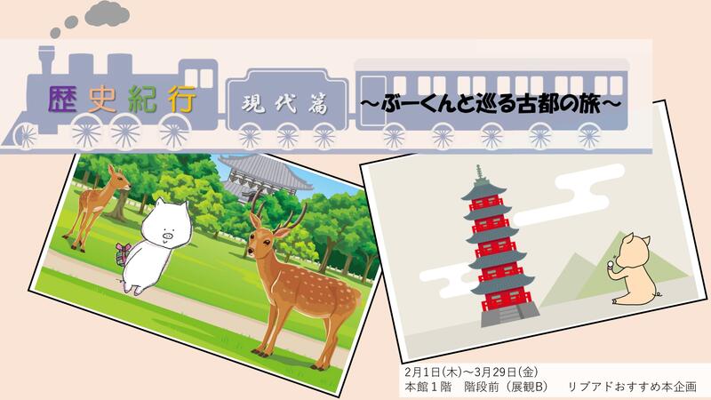 本館1階おすすめ本コーナー、2,3月のテーマは「歴史紀行 現代編 ~ぶーくんと巡る古都の旅~」です。