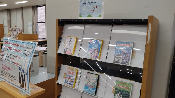 今月の「月替わり学部・文庫・DVDコーナー」は『みんなでジブリを見よう!!』と題したDVD6選です。皆さんはジブリ作品をご存知ですか?ジブリは自然観や音楽観が素晴らしく観ていると、とても心が穏やかな気持ちになります。ジブリでの季節感は夏が多く、今年の夏はどんな夏だったかジブリを通して夏をふり返ってみませんか?普段ご紹介させていただいているDVDは洋画や邦画が多く、それらとはまた別の、様々なジャンルの映像資料も取り扱っています。ぜひこの機会にお試しください。(自動化書架の使い方で困ったらお近くのスタッフまでお声掛けください)