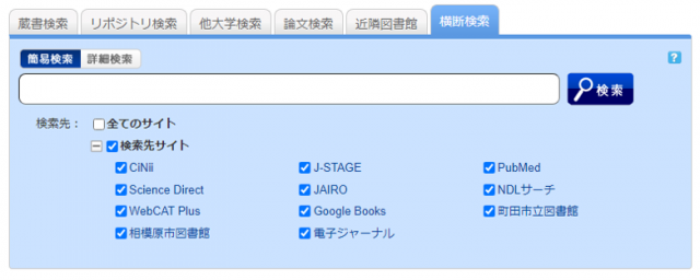 | 資料種別 | 検索対象とする資料の種別を絞り込みます。 | 全て/図書/雑誌などの資料種別をチェックボックスでチェックします。 |