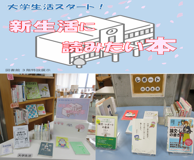 現在、図書館3階特設コーナー、ミニ展示コーナーにて大学生活スタートに向けたレポートの書き方や生活・暮らしに関する本などを展示しています。