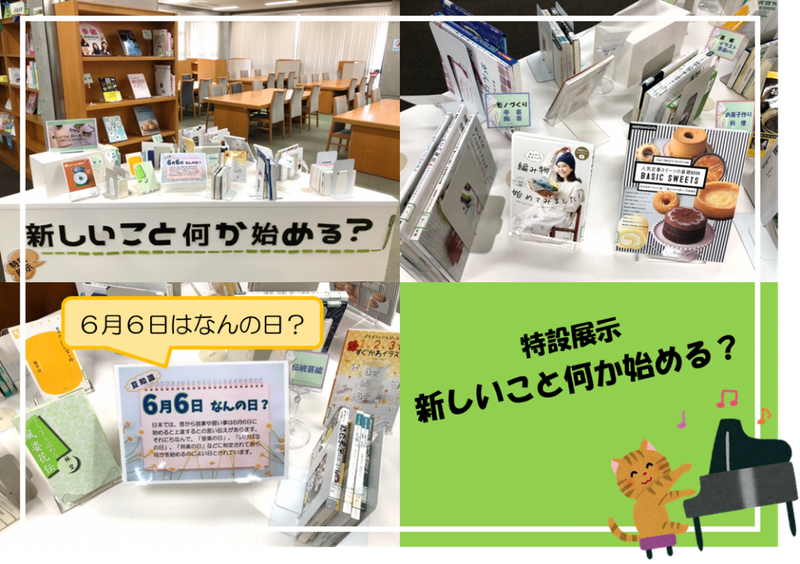 展示中の図書については、図書館ホームページの「タグ検索」→新しいタグ「特設展示(何か始める?)」でご覧いただけます。